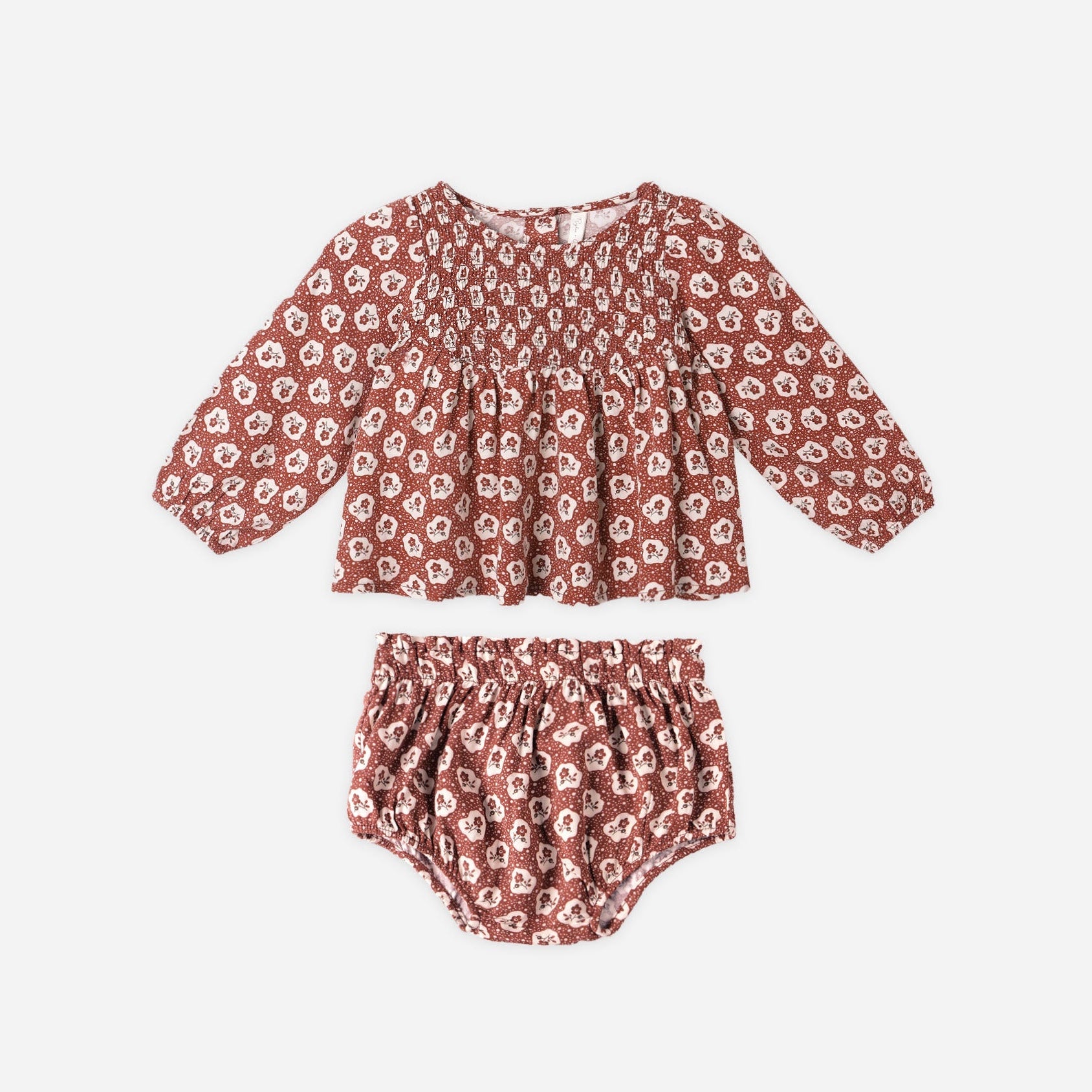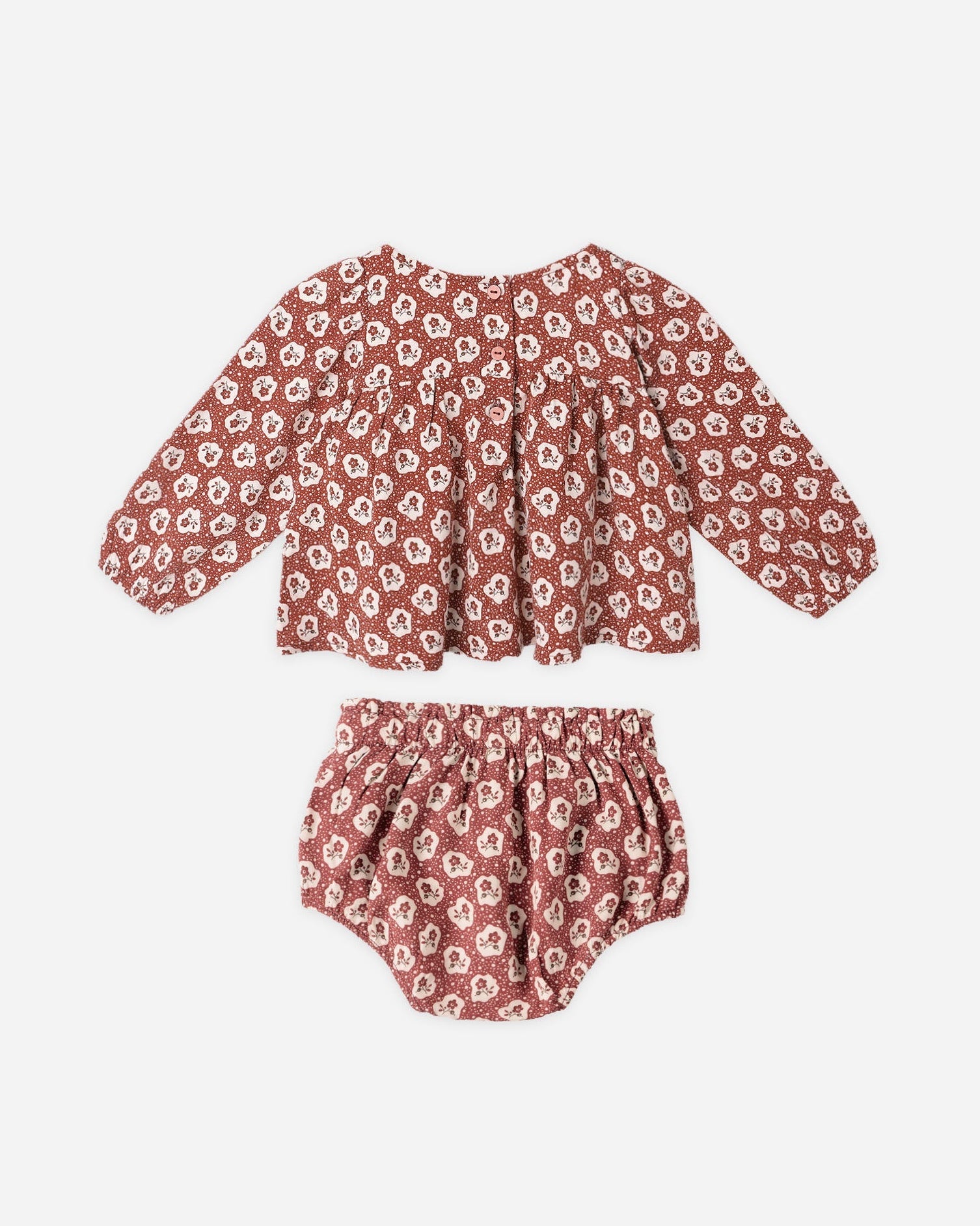 Our Sophia Top & Bloomer Set features a full gathered blouse, balloon sleeves, button backing, and matching bloomers with a ruffle at the waist.