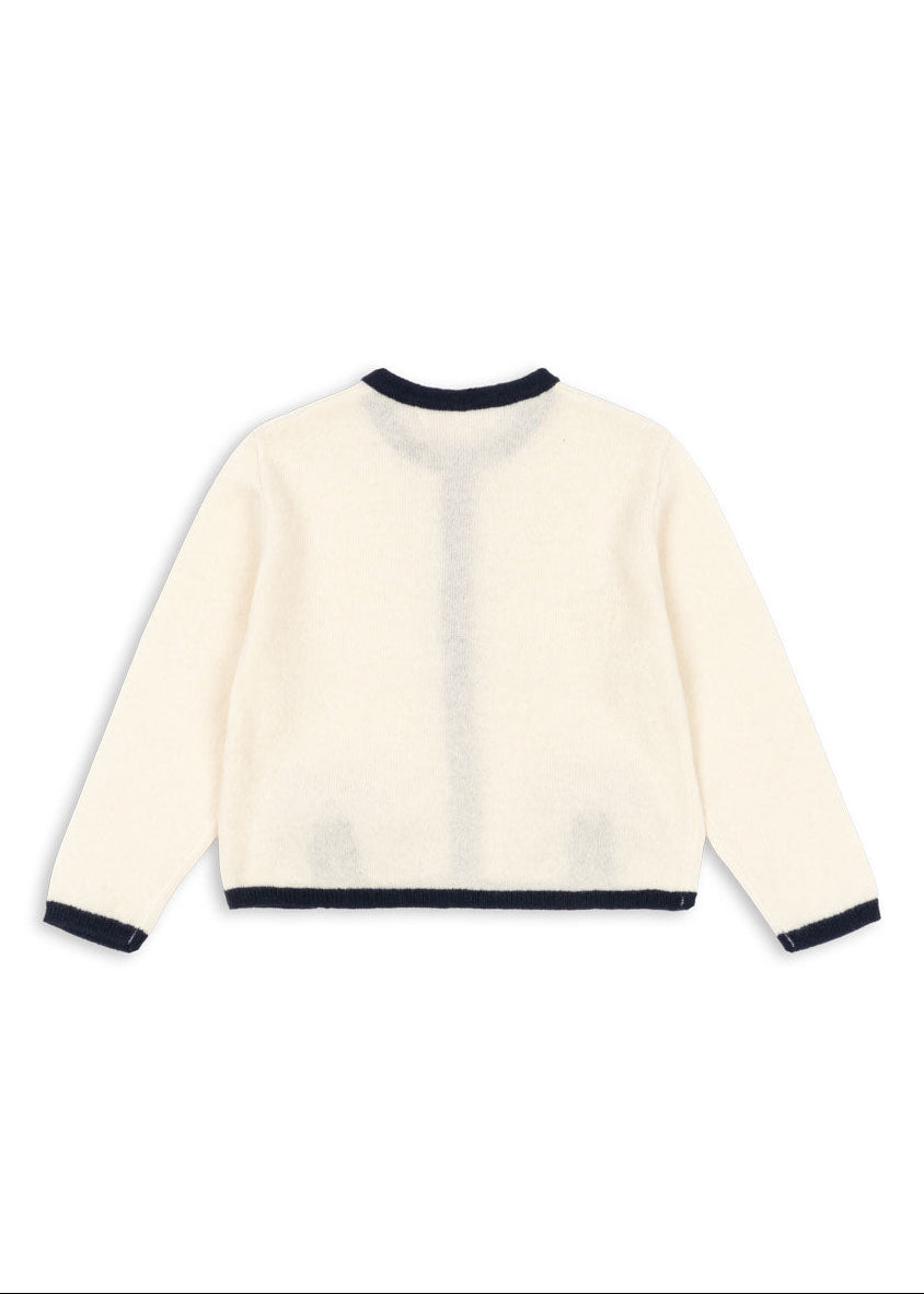 Soft 100% wool cardigan with bow detailing. Classic design with round neck, contrast edges, and mother of pearl buttons.