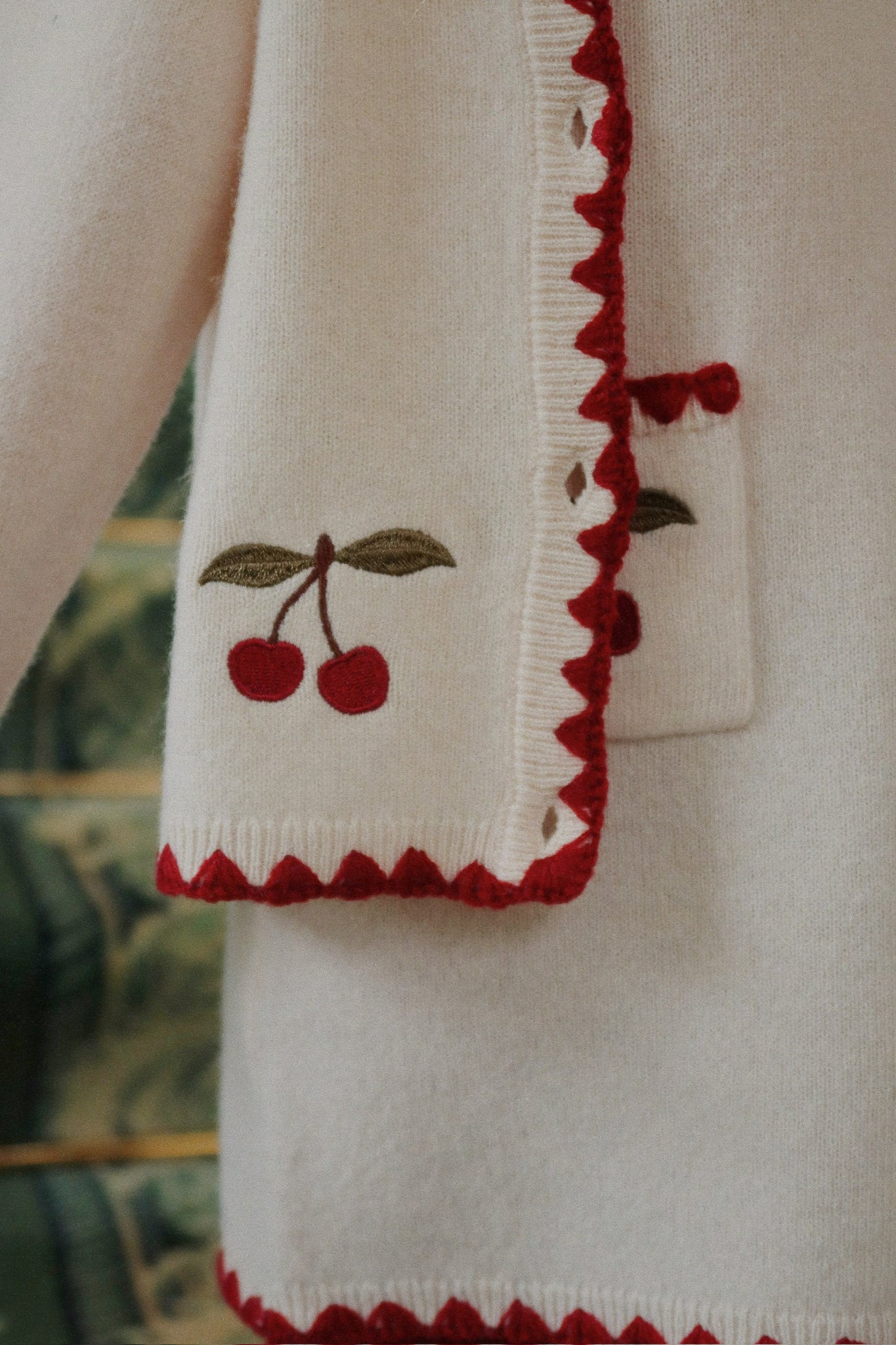 Cream-colored cardigan with red trim and cherry patterns on a white background