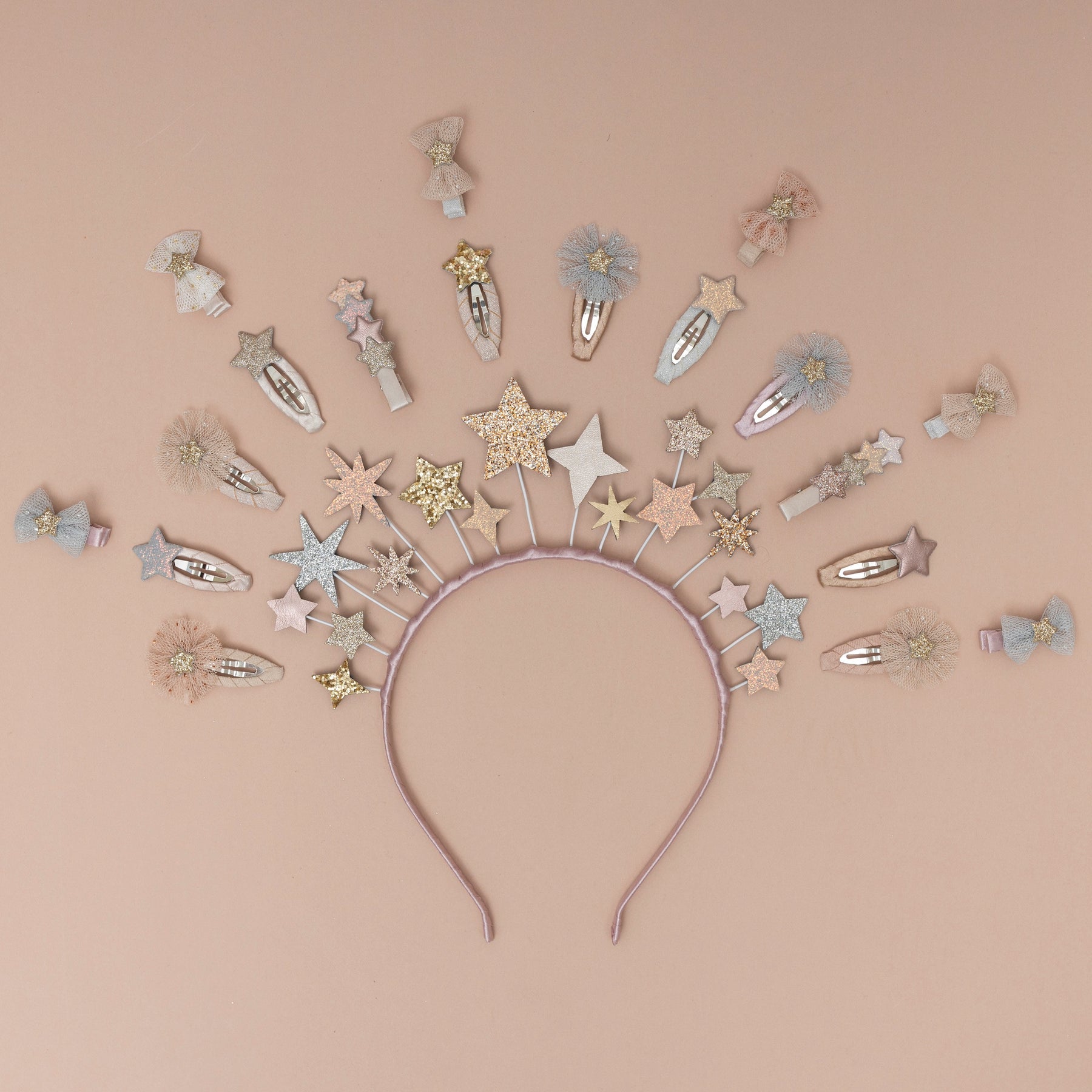 • 4cm ribbon wrapped clic clac clips featuring gold glitter star centres, layered over soft tulle rosettes flecked with sparkle