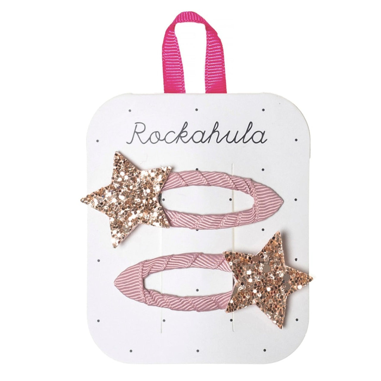 Catch the stars and wear them in your hair with our beautiful clips! Two super sparkly rose gold glitter stars each secured to a soft dusky pink grosgrain ribbon wrapped snap clip.