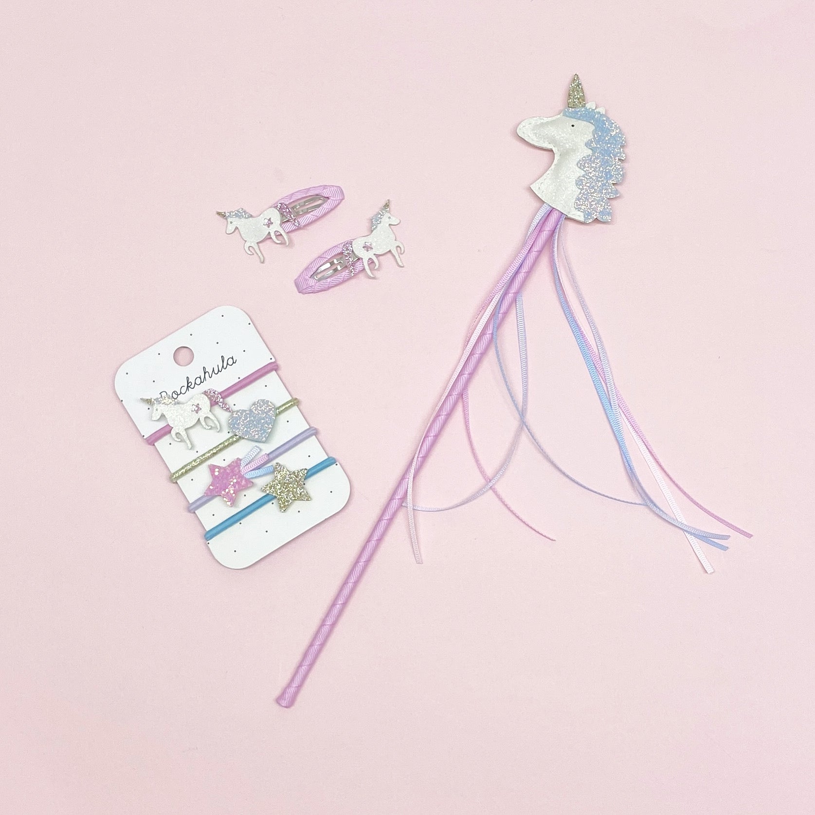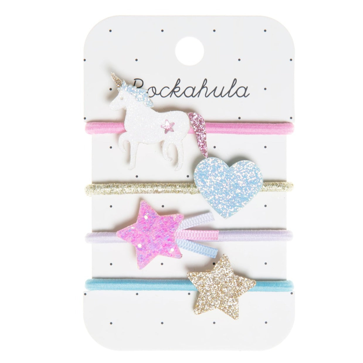 We believe in unicorns! And so can you, with our glittery unicorns! This four pack of elastics are all different and include our unicorn, a glittery heart, a gold star and a pink shooting star.