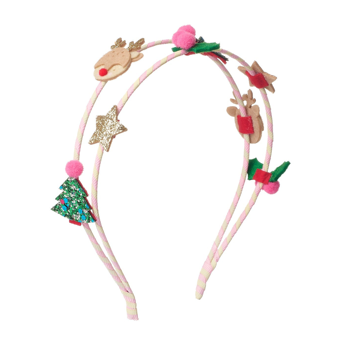 Our festive double headband features two bands of Christmas charms including our sweet reindeer, Christmas tree, glitter stars and holly! Perfect for those festive days and Christmas parties. Wrapped in stripy pink grosgrain ribbon, this headband is designed to provide a comfortable fit for little heads.