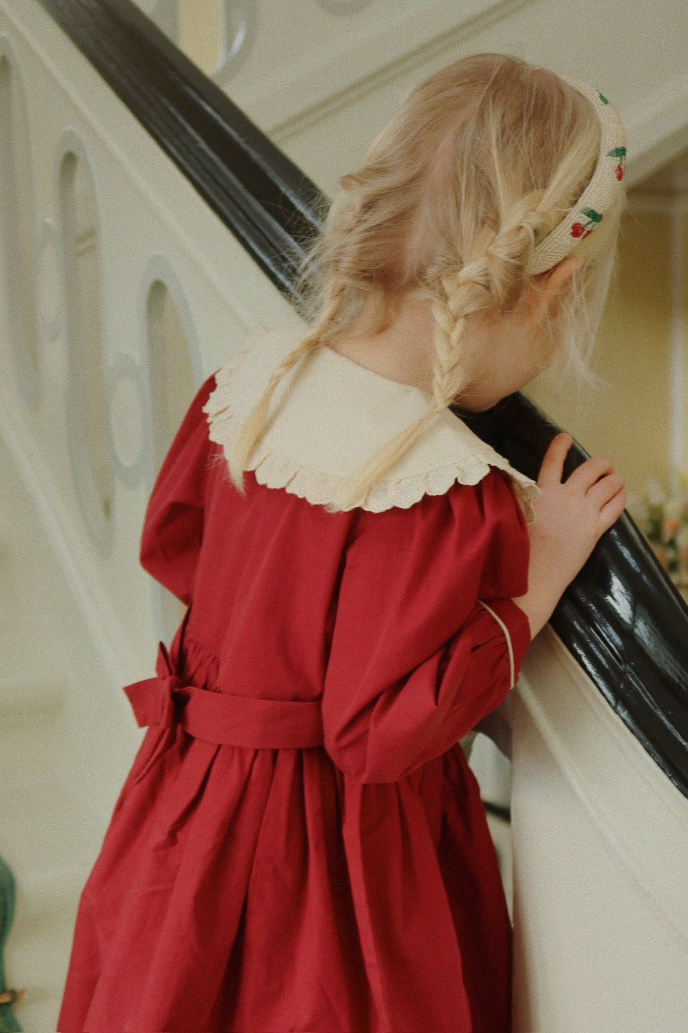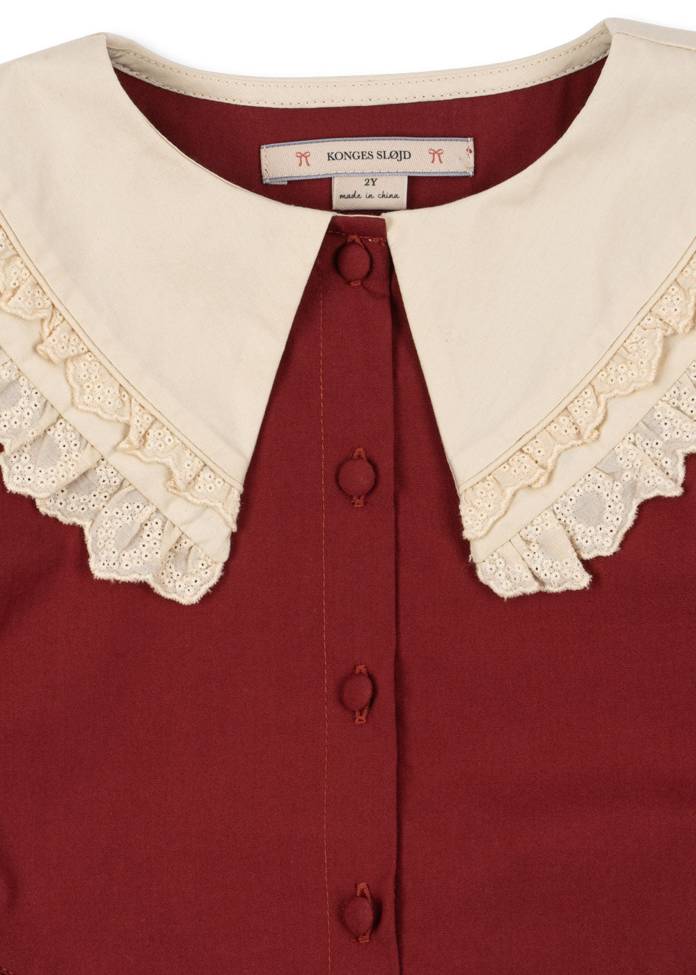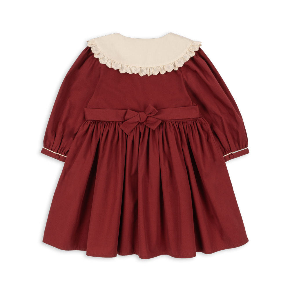 Classic dress with a round lace collar and puff sleeves. Designed with fabric covered front buttons and straps that tie with a bow in the back for a perfect fit.