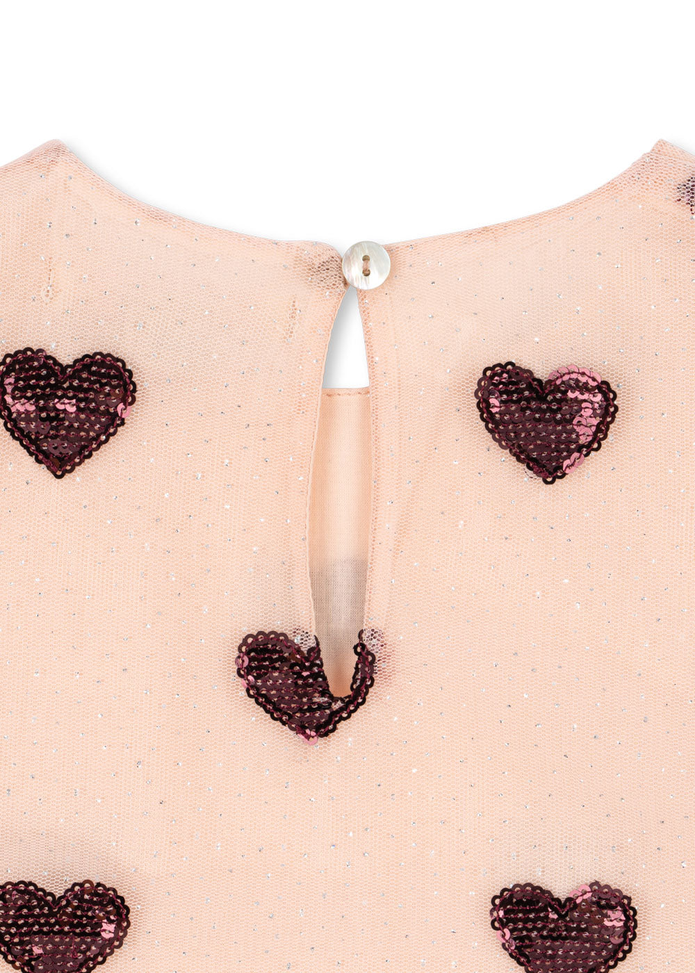 Tulle dress with all-over sequin applications. Designed with puff sleeves and a voluminous skirt that swooshes when you move.