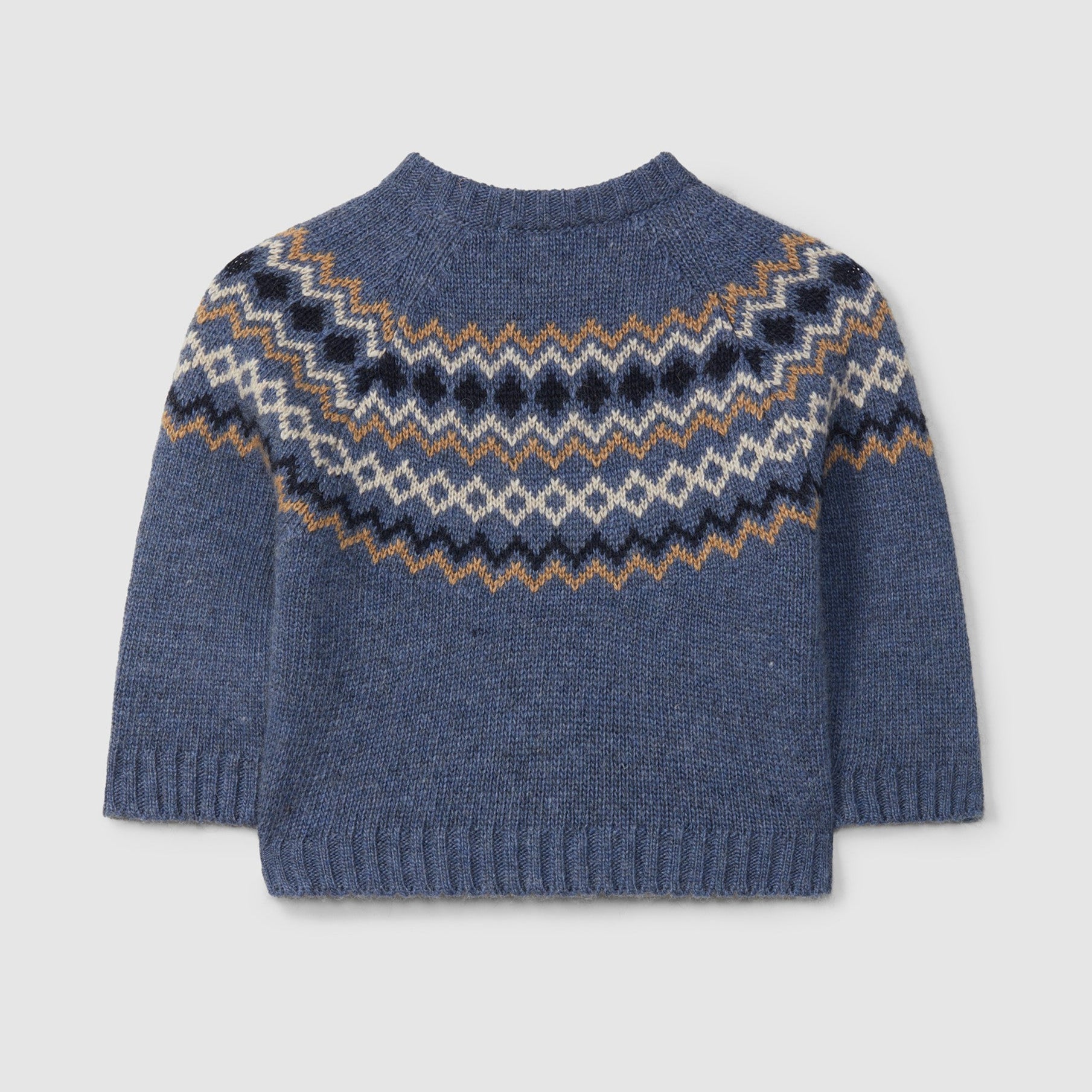 Knitted jumper with jacquard with a touch of cashmere. Fastens with wooden Laranjinha buttons at the front until 24 months.