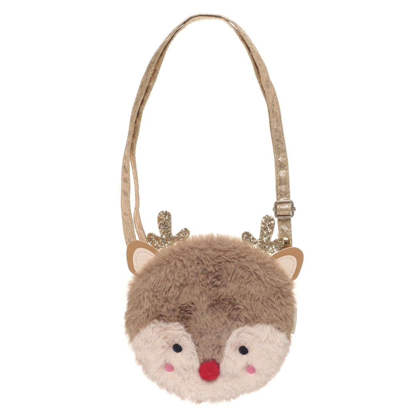 This cosy little reindeer bag is perfect for stashing all manner of Christmas treats! Made from the softest brown fur, with sparkly gold antlers and a cherry red pom pom nose. Fully lined in gold star fabric, this furry bag features a magnetic dot closure and a gold strap with a break point for safety.