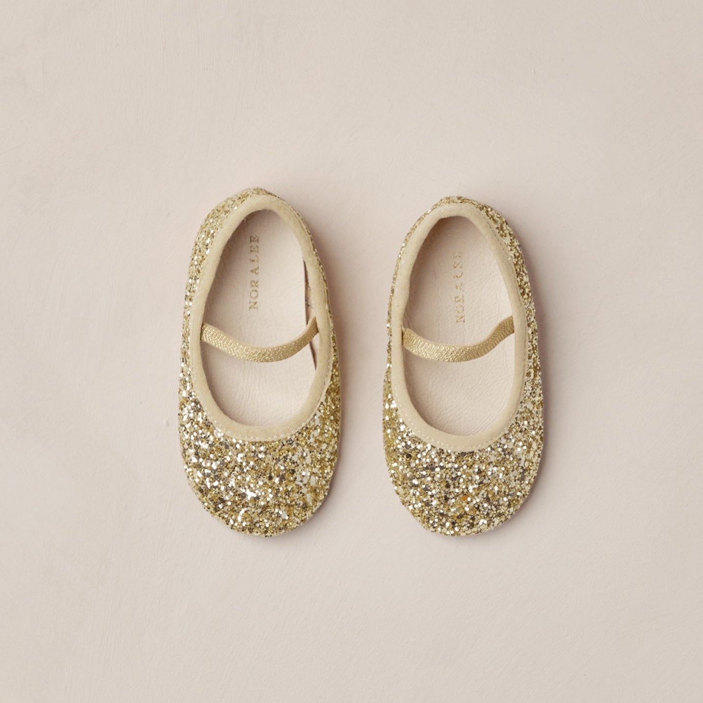 Pair of gold glittery ballet flats on a beige background