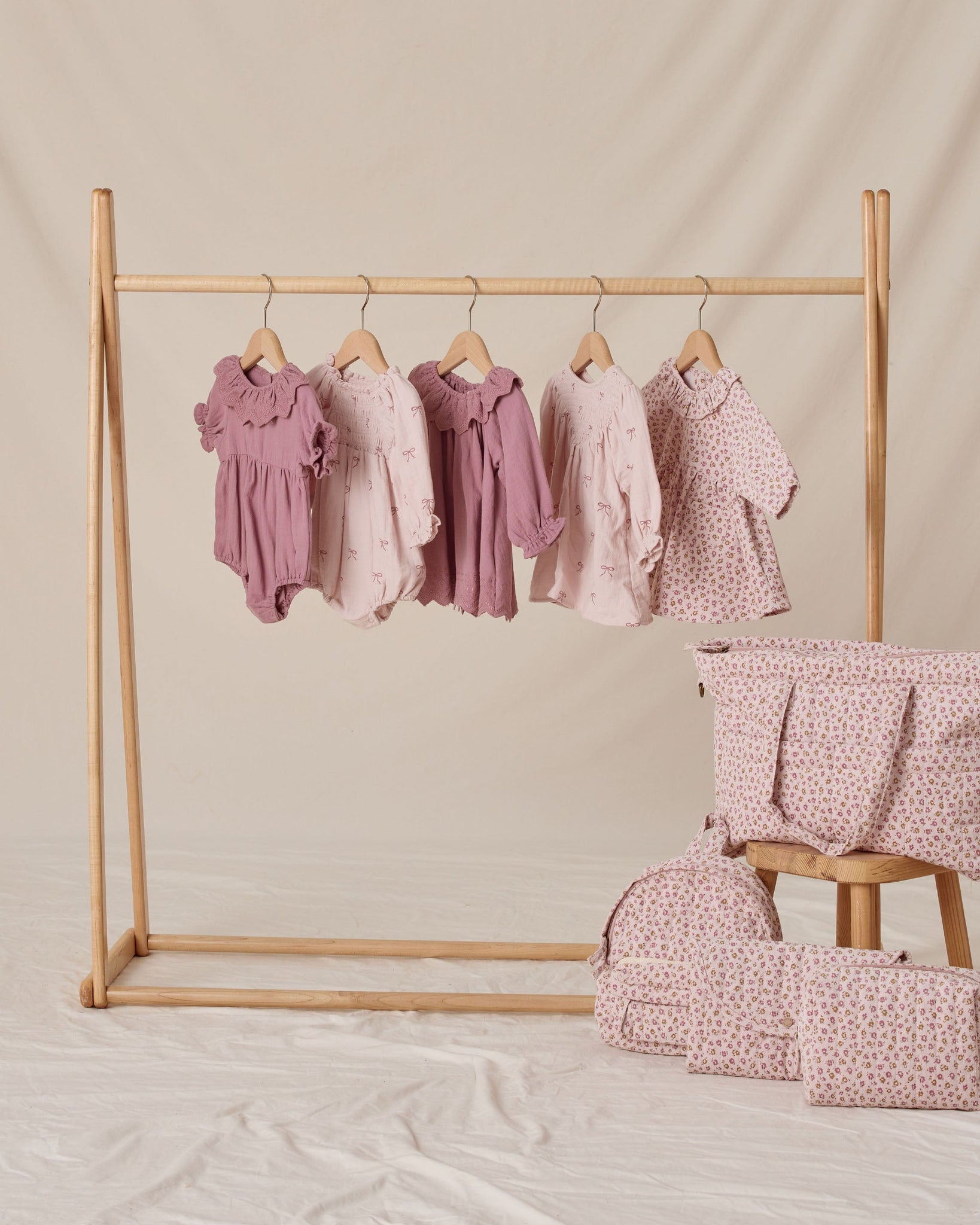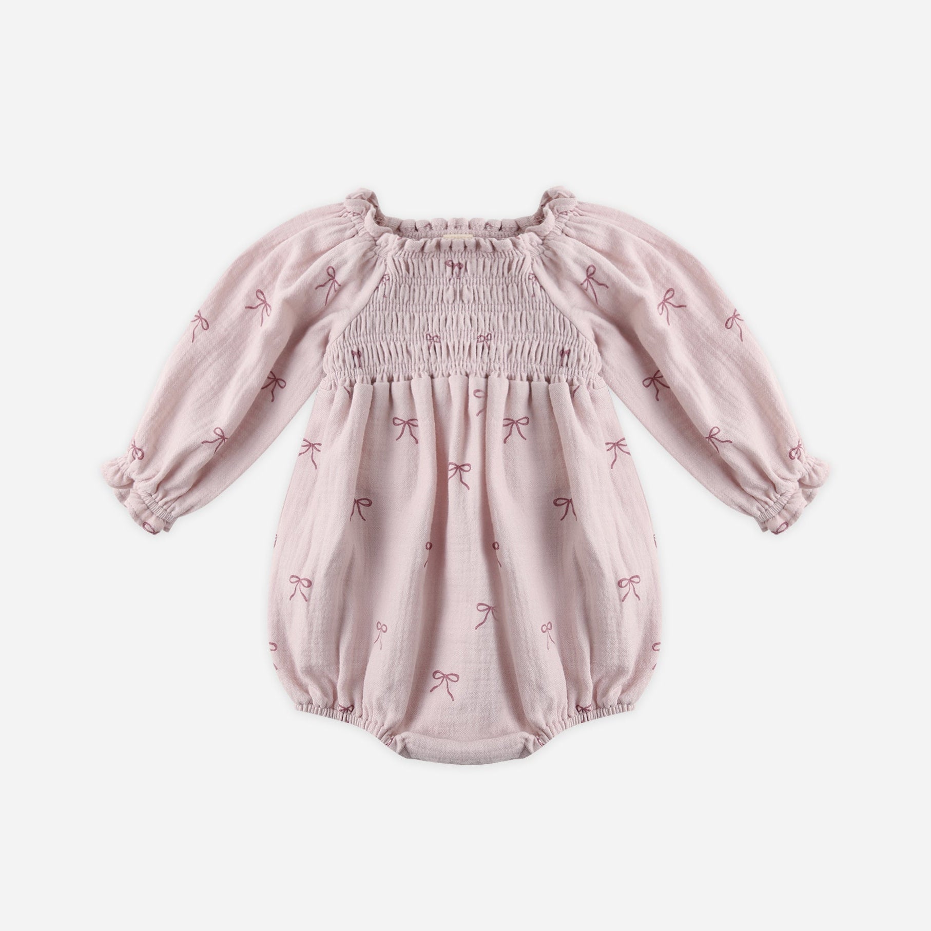 Our Eden Romper features delicate smocking across the chest, gathered ruffle details at the wrists, and a sweet ruffled neckline—an effortlessly charming piece for your little one.
