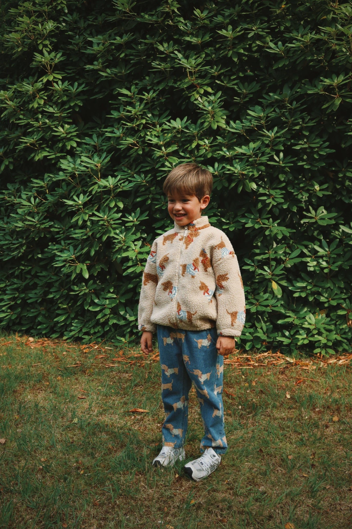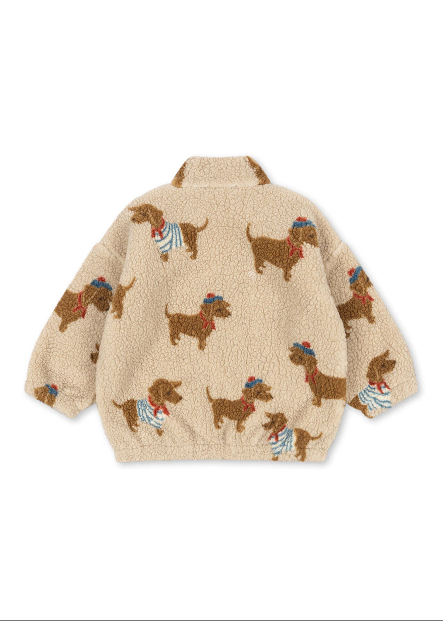 Warm pile jacket with soft and smooth inside fleece lining. Features a high collar and elasticated cuffs, and a full zipper closure in front that makes it easy to put on.