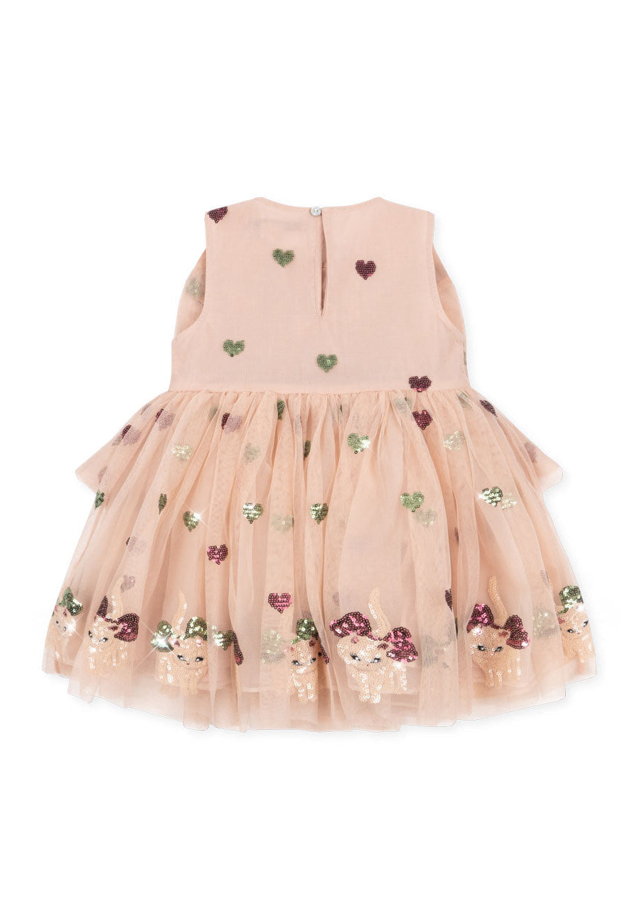 The dress is designed in a flowy silhouette with a skirt that swooshes and sways when you play and dance, and is adorned with decorative kitties.