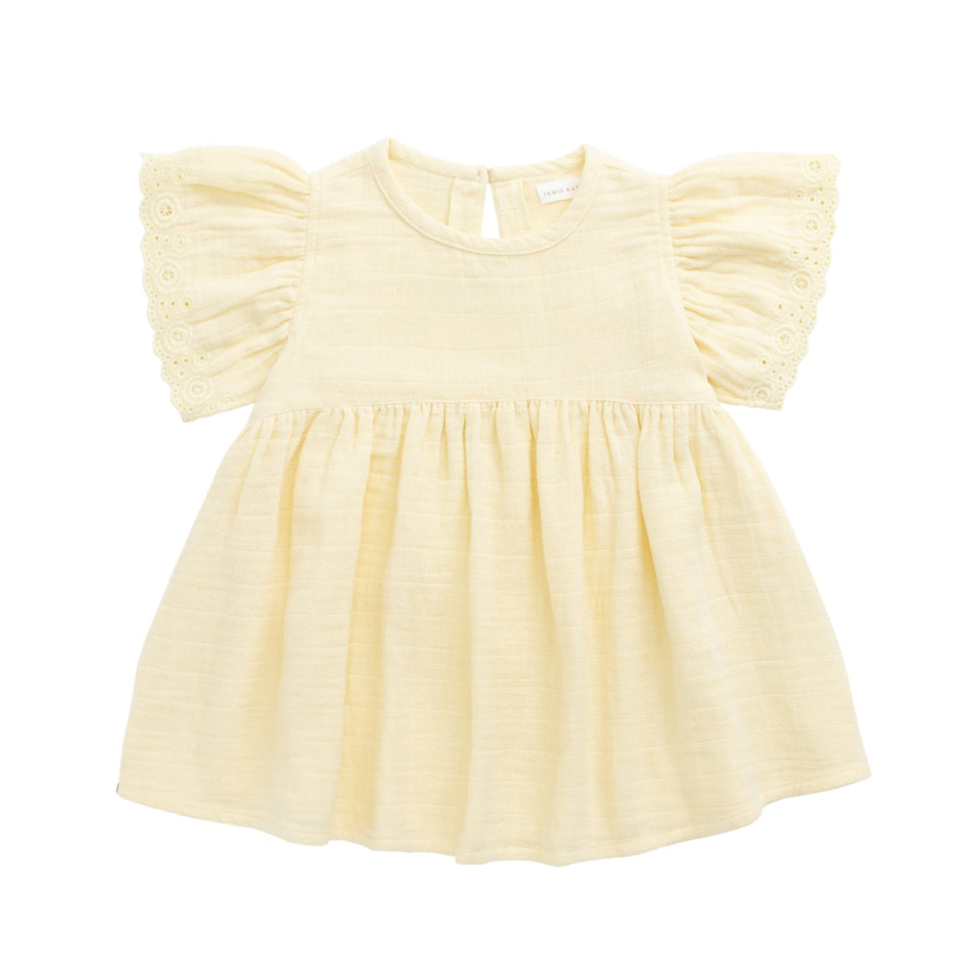 A gentle burst of warmth and charm, the Phillipa Dress in Sunshine is designed to delight. This beautiful yellow dress features ruffled sleeves, delicate trim detailing, and a sweet button closure at the back of the neckline. Made from 100% Organic Cotton Muslin, it offers a breathable, lightweight feel that’s perfect for summer adventures or layering through cooler seasons.