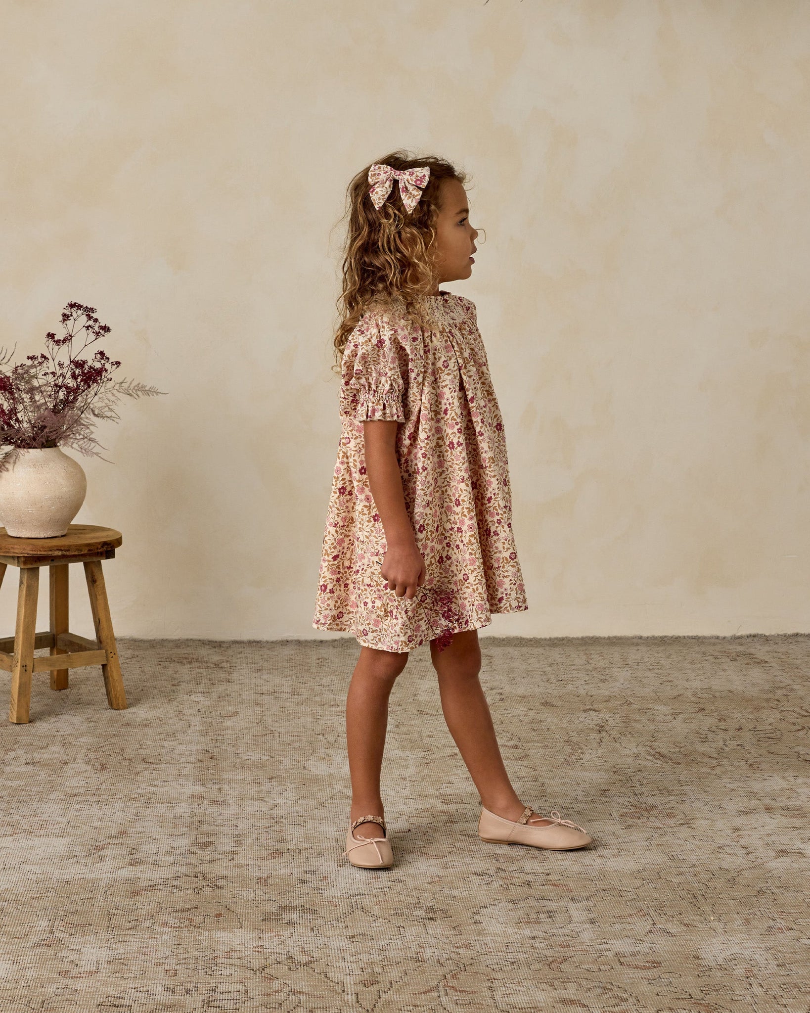 A smocked neckline adorned with delicate floral embroidery accents this vintage-inspired dress, crafted from our soft swiss dot textured fabric. Coordinating bloomers included with sizes 12M–2Y.