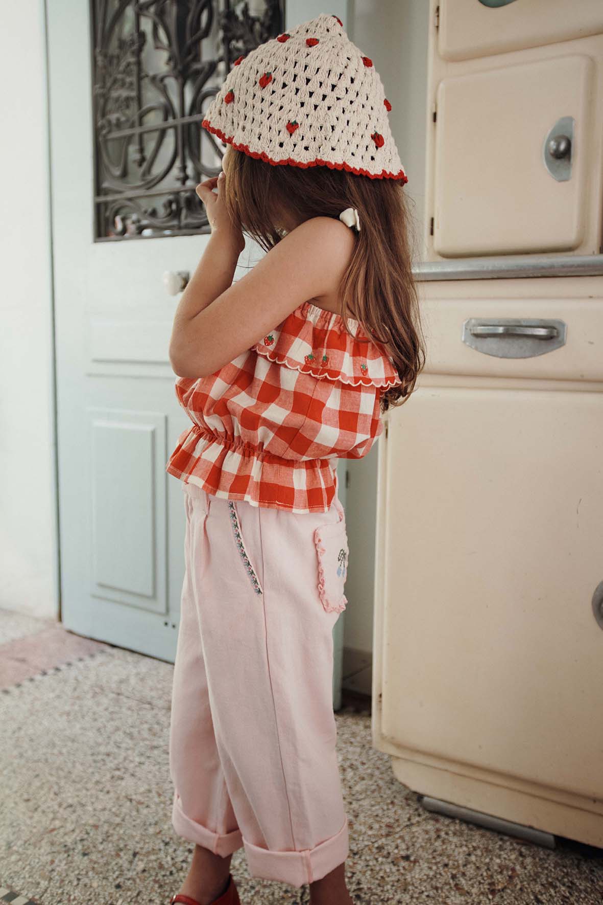 Top with straps in organic cotton gingham with large red and ecru checks to enjoy the summer heat lightly dressed, in Saint-Trop' or elsewhere.