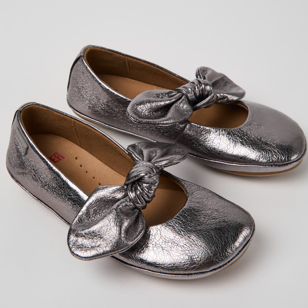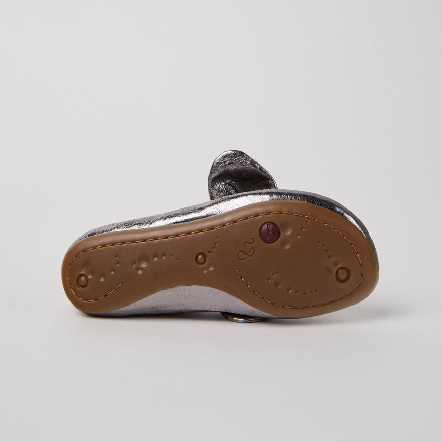 Silver calfskin leather kids' ballerina shoes with EVA footbeds and rubber outsoles.