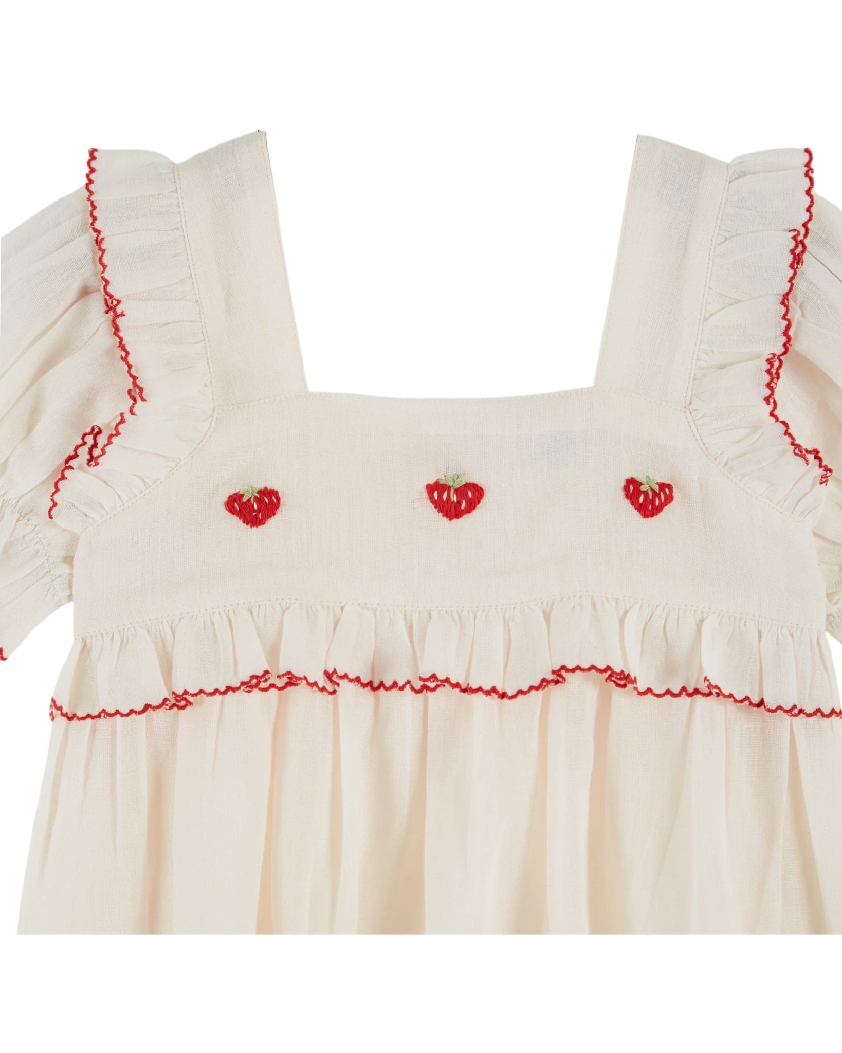 - 3 embroidered strawberries in the center of the yoke