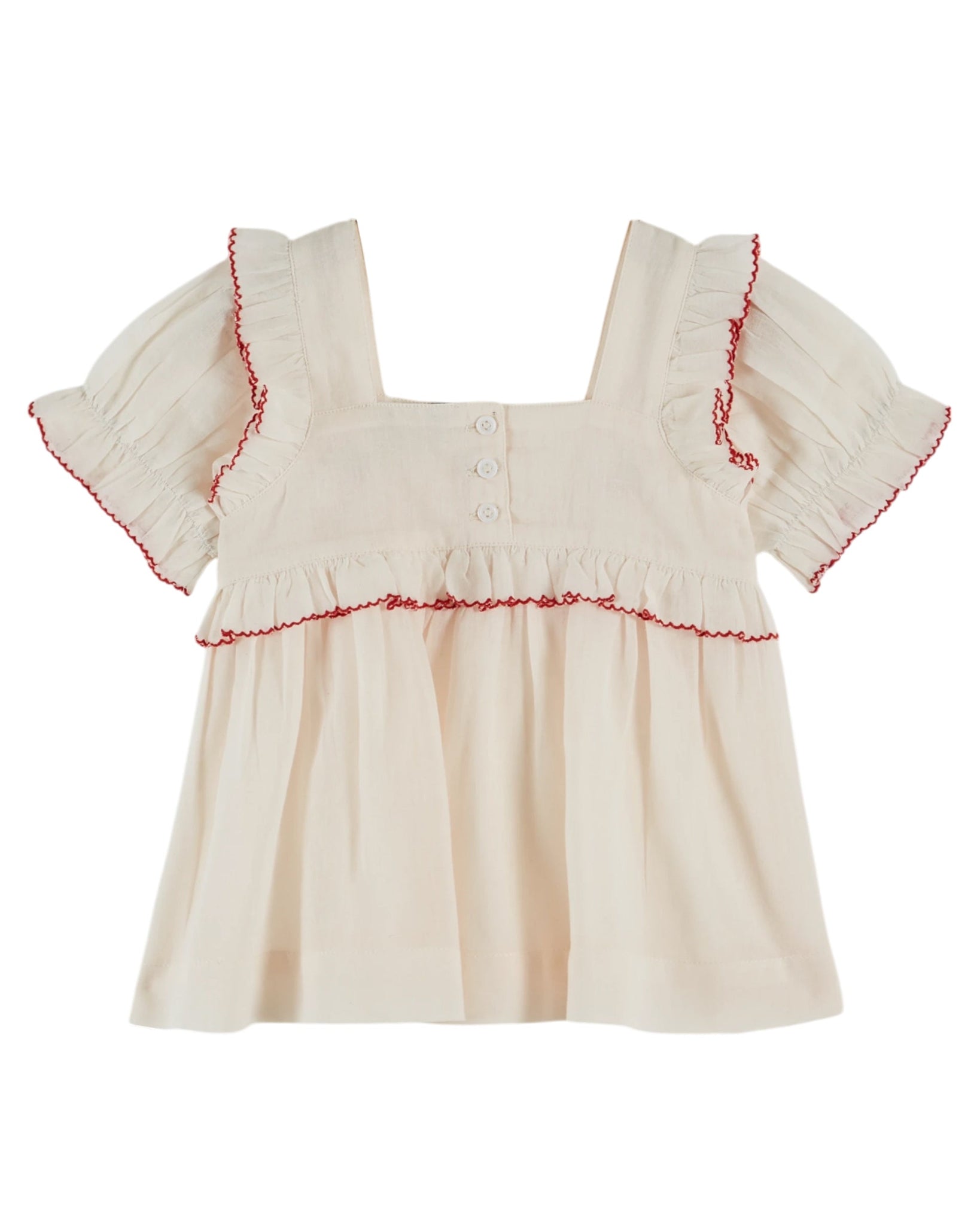 - Gathers and scalloped frills under the cut-out of the front yoke