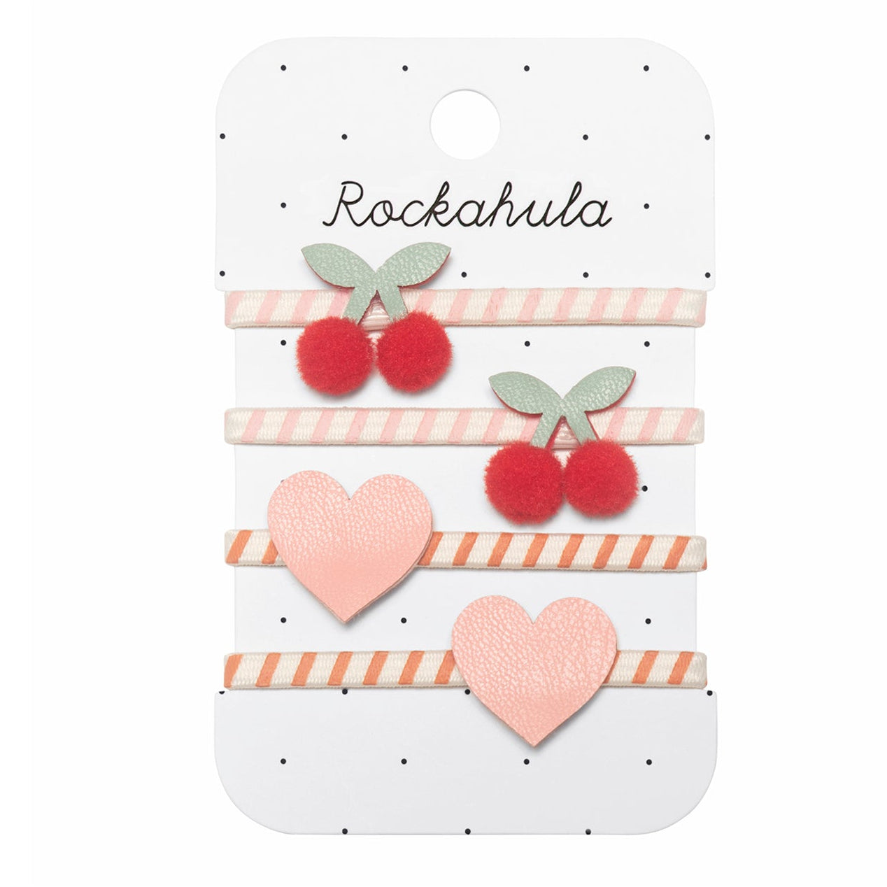 Stay sweet with this set of four cherry ponies! Fun pom pom cherries with detailed green stems adorn two pink striped elastics, whist two cute pink love hearts adorn the other two order striped elastics.