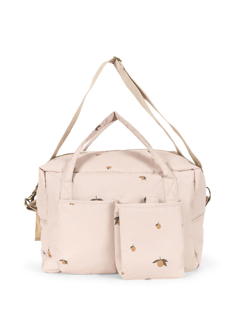 Features two outside pocket compartments for wet wipes and a bottle. The bag includes a removable padded changing mat, and has a large storage capacity that makes it ideal as a weekend bag. It has a removable and adjustable shoulder strap option, as well as a grab-and-go handle.