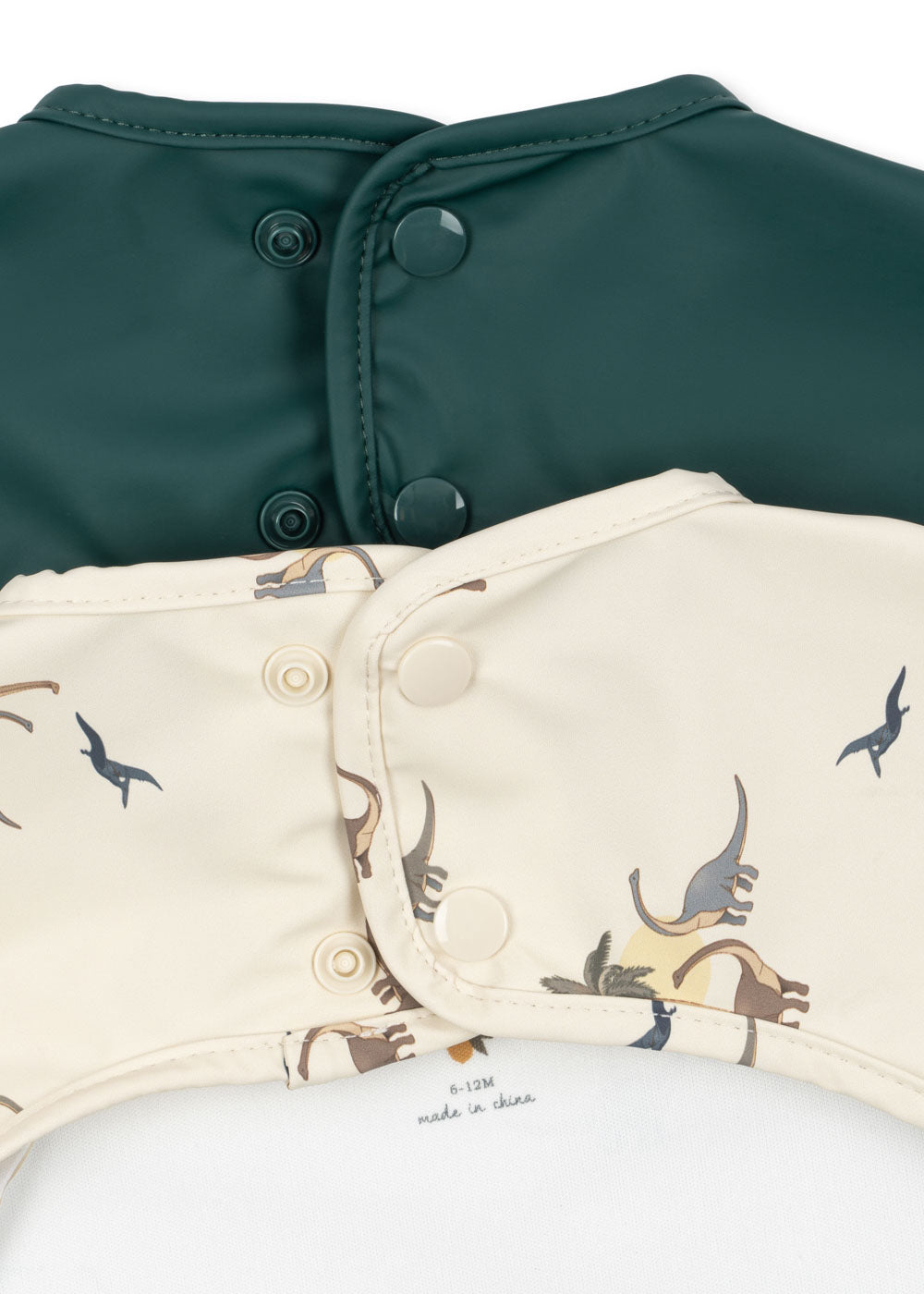 Cute and practical dinner bibs made in a practical water-repellent quality that is easy to clean. Designed with sleeves for full coverage and adjustable push button opening in the back.
