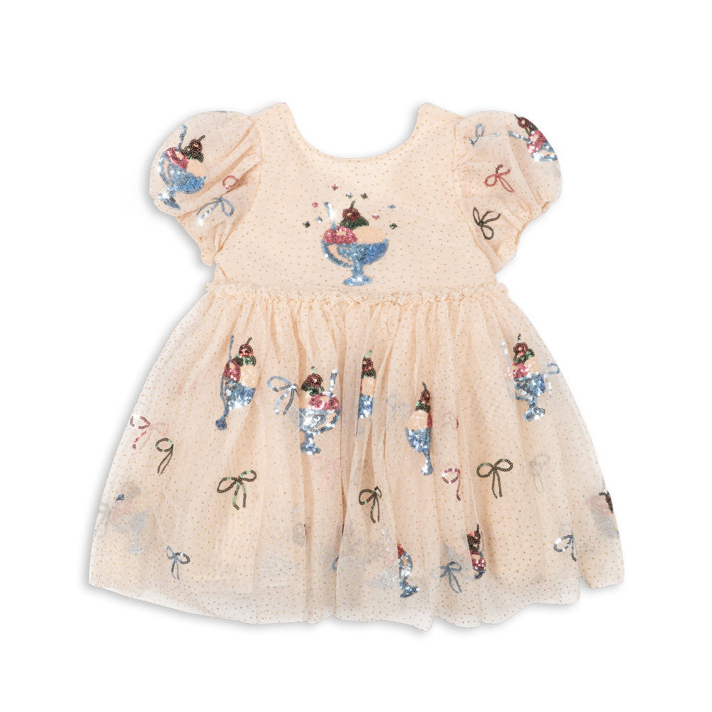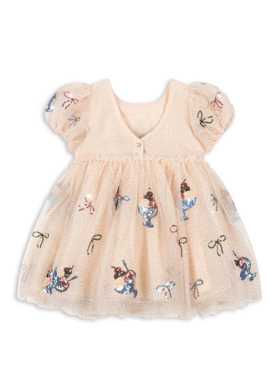 The dress is designed in a flowy silhouette with a skirt that swooshes and sways when you play and dance, and is adorned with decorative sequin embroidery for the perfect finishing touch. Lined with soft cotton for comfortable wear.