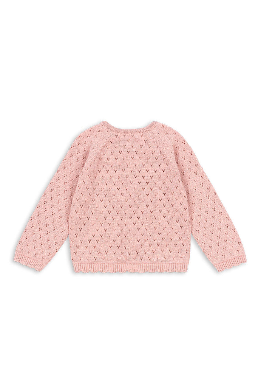 Light cardigan with a delicate eyelet knit pattern. Finished with classic rib hems and full button closure.