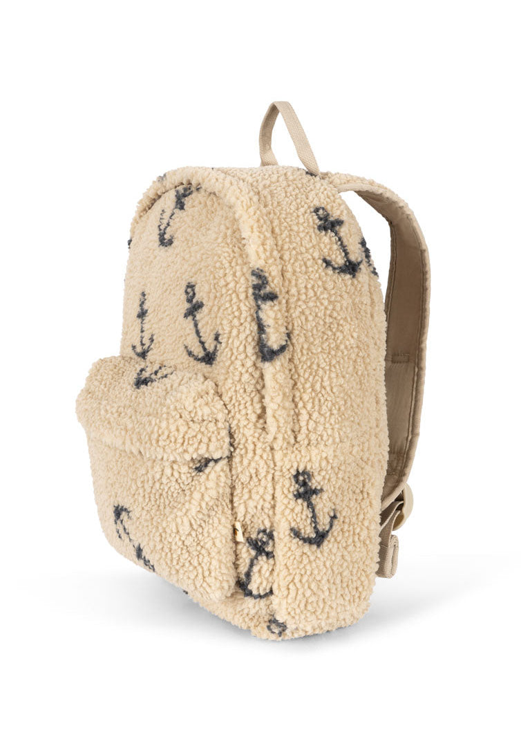 Soft backpack made from fluffy pile fleece. Designed with one big inside compartment, side pockets, a zipper pocket in front, adjustable back straps, and a chest strap for extra support.