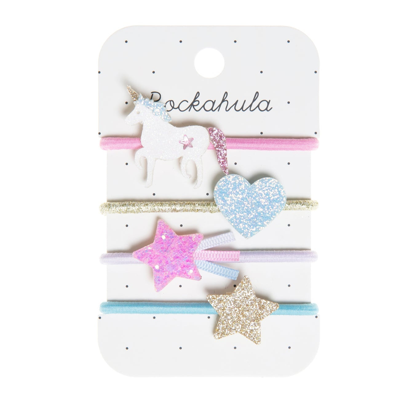 We believe in unicorns! And so can you, with our glittery unicorns! This four pack of elastics are all different and include our unicorn, a glittery heart, a gold star and a pink shooting star.