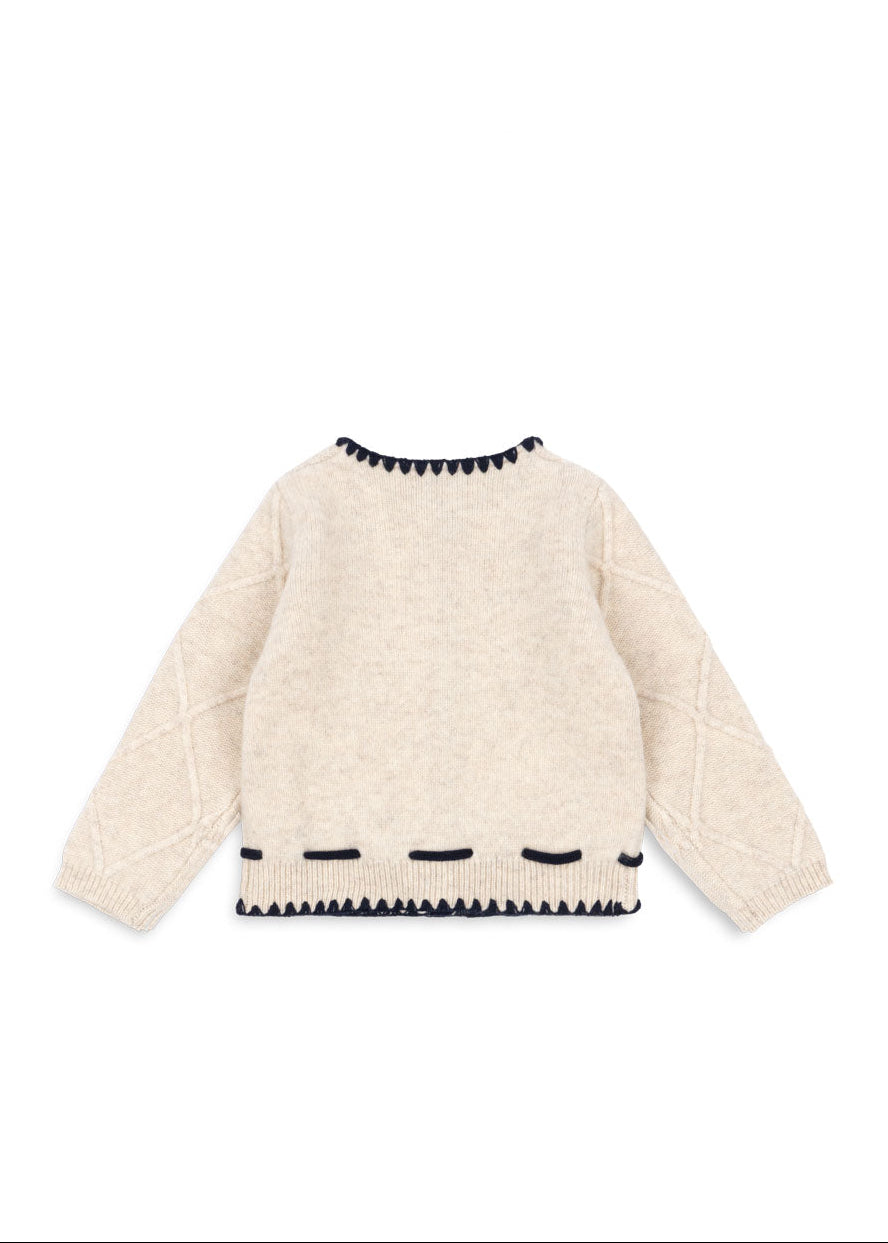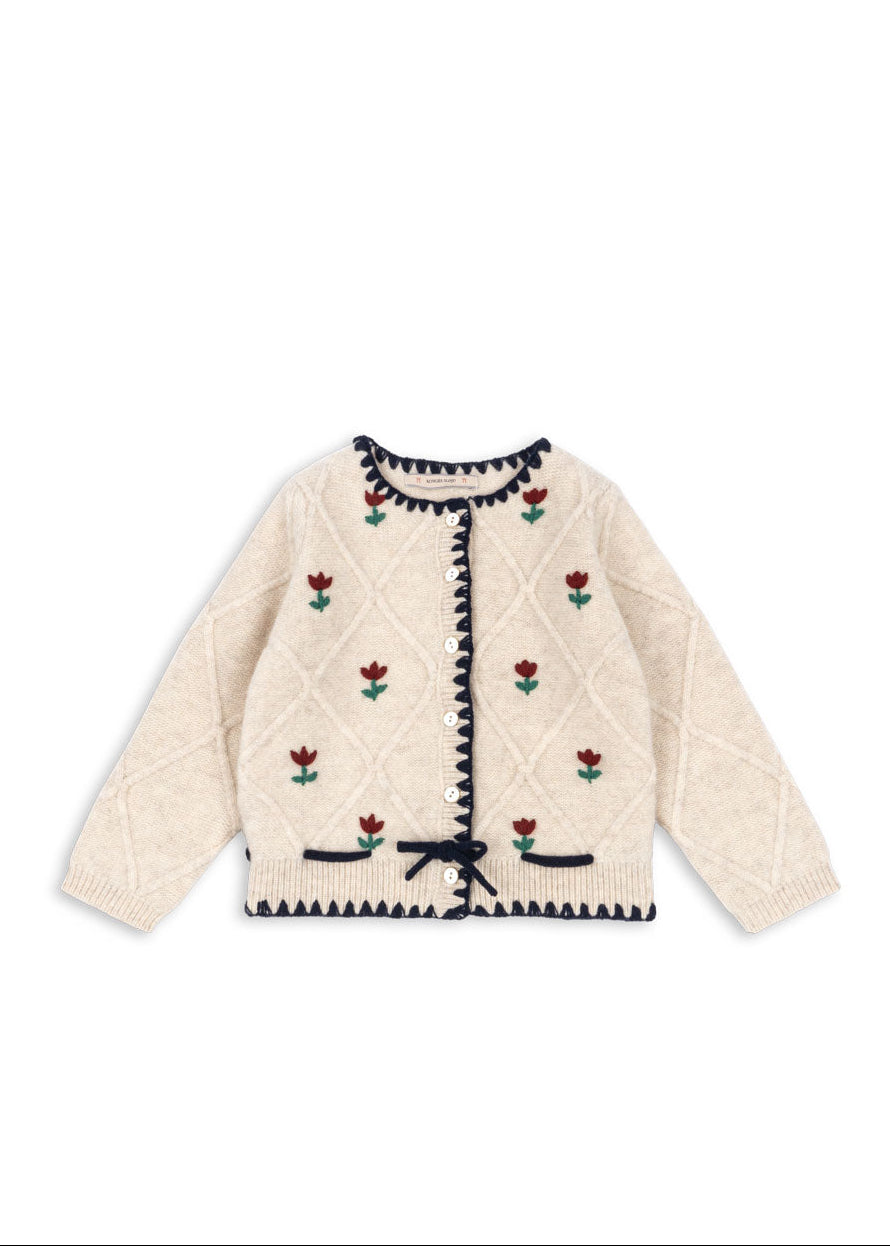 Knitted cotton cardigan with intricate detailing. Made with delicate flower embroidery, contrast colored edges, and full button opening in front. Finished with a drawstring detail at the bottom that ties in front.