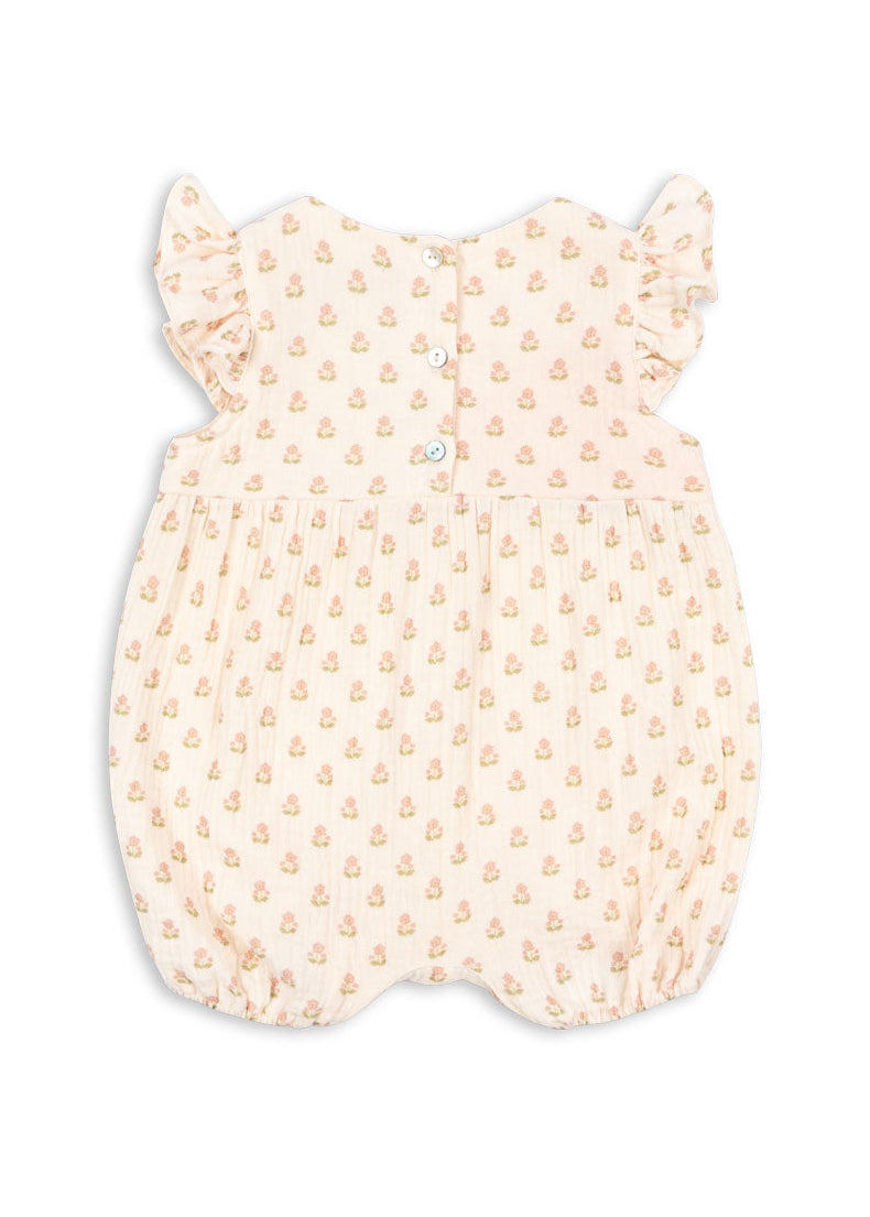 Romper made in a soft muslin fabric that is light and breathable. Features press buttons at leg opening for easy dressing.