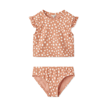 PRINTED RUFFLE-TRIMMED BIKINI A bikini with a tad more coverage, the two-piece, UV40+ protective Judie bikini set has a ruffle-trimmed top with and a pair of comfortable, classic bottoms.